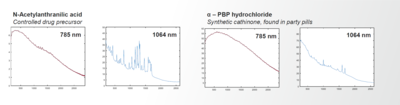 - Automatická optimalizace parametrů analýzy v průběhu měření postavená na pokročilých algoritmech (včetně kontinuální kompenzace spektrálního pozadí). Nejnovější generace detektoru a elektroniky ve spojení s použitými algoritmy zajišťuje také vysoký dynamický rozsah měření i při použití InGaAs detektoru. Nedochází k saturaci detektoru při analýze vzorků s vysokou fluorescencí. Následující obrázky demonstrují kvalitu spektrálních dat pro vzorky s vysokou vlastní fluorescencí, je zde porovnání s typickými Ramanovými spektrometry s excitačním laserem 785 nm. Zajímavé je srovnání pro některá červená vína, spektrometr 1064Defender poskytuje kvalitní spektrum při době měření 10s a je tak schopen spolehlivě a rychle identifikovat kokain rozpuštěný v červeném víně.