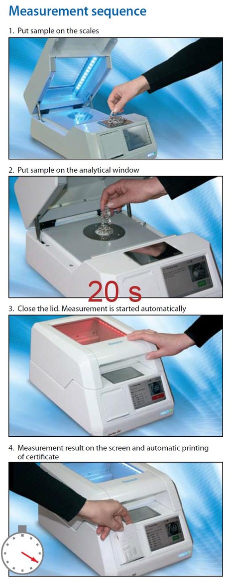 Spektrometr umožňuje provézt kompletní analýzu vzorku, včetně jeho vložení, zvážení, analýzy a vytištění výsledků za 20 s! Obsluha položí vzorek na váhy, následně jej umístí do měřící polohy (měřený bod může snadno kontrolovat na displeji interního počítače nebo na LCD obrazovce PC), zavřením víka spektrometru se automaticky spustí analýza a po jejím zkončení se vytiskne výsledek.