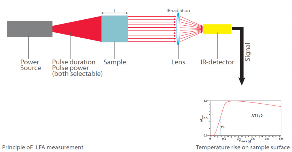 Vzorek je buď umístěn do autosampleru v pícce nebo v jednom z pěti mikroohřívačů. Během měření je pak pícka udržována na konstantní teplotě a programovatelné energetické pulsy ozařují zadní stranu vzorku, čímž dochází k homogennímu nárůstu teploty povrchu vzorku. Nárůst teploty povrchu je měřen velmi citlivým vysokorychlostním IR detektorem. Teplotní difuzivita a měrná tepelná kapacita mohou být stanoveny ze závislosti teploty na čase. Pokud je známá i hustota vzorku, může být dopočíta i teplotní vodivost.
