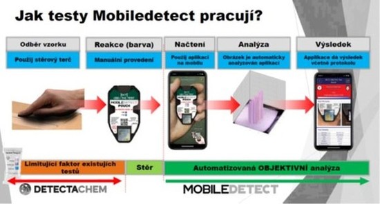 Testy MobileDetect od firmy DetectaChem jsou nová alternativa k tradičním kolorimetrickým testům pro testování drog a výbušnin v terénu. Systém využívá cartridge se stěrovou páskou ve spojení s objektivním vyhodnocením pomocí mobilního telefonu a aplikace pro systém Android (7.0 nebo novější) nebo iOS (13.0 nebo novější). Obrázek a video níže ukazuje průběh testu pomocí cartridge MobileDetect.