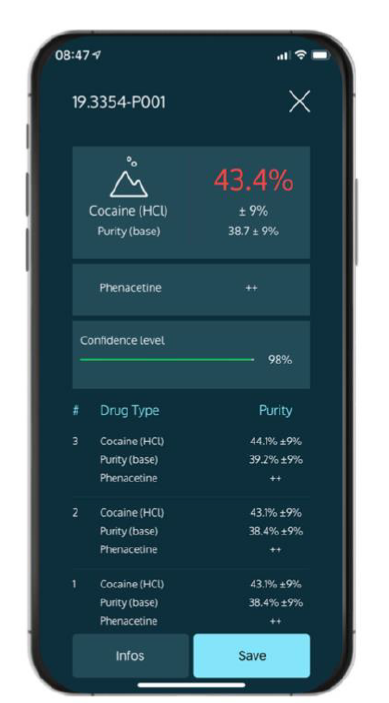 - Výsledky analýzy z NIRLab cloud jsou odeslány zpět na mobilní telefon/tablet a zobrazeny v aplikaci NIRLab Mobile App. Příklad výstupu analýzy vzorku kokainu je na obrázku. Jsou zde tři opakování analýzy jednoho vzorku kokainu (vzhledem k nehomogenitě reálných vzorků se doporučuje provádět více analýz z jednoho vzorku). Díky vysoké rychlosti analýzy je možné provádět snadno větší počet analýz a získat tak výsledek, který reprezentuje průměrné složení celého zadrženého množství látky. Výsledná koncentrace je uvedena v %, chyba pak v relativních procentech u heroinu, kokainu a MDMA. V tomto případě je tedy absolutní chyba u stanoveného obsahu 43,1% kokainu (HCl) cca 3,8%. V případě marihuany je výsledná chyba uváděna rovnou již jako absolutní chyba v %. Data zasílaná mezi spektrometrem, cloudovým řešením a mobilní aplikací jsou do tohoto okamžiku anonymizovaná a velmi malá (pouze spektrální data). Uživatel může nyní data uložit stisknutím jednoho tlačítka a výsledky včetně určení polohy jsou uloženy do chráněné cloudové databáze, která je vytvořena pro jeho organizaci.