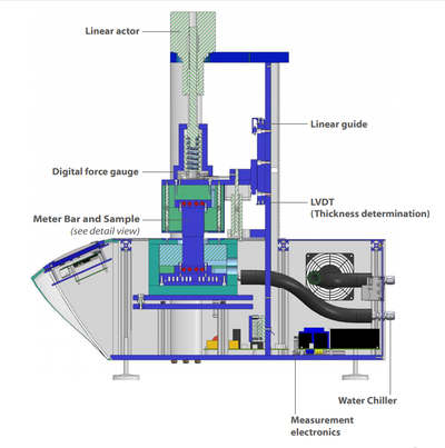 Vzorek je umístěn mezi ohřívanou a chlazenou měřící tyč. Kontaktní tlak na vzorek může být automaticky upravován pomocí integrovaného systému (pro zjištění tlakové stability v teplotní rozsahu). Rozměry vzorku (tloušťka) mohou být vloženy manuálně nebo mohou být měřeny a kontrolovány integrovaným senzorem.